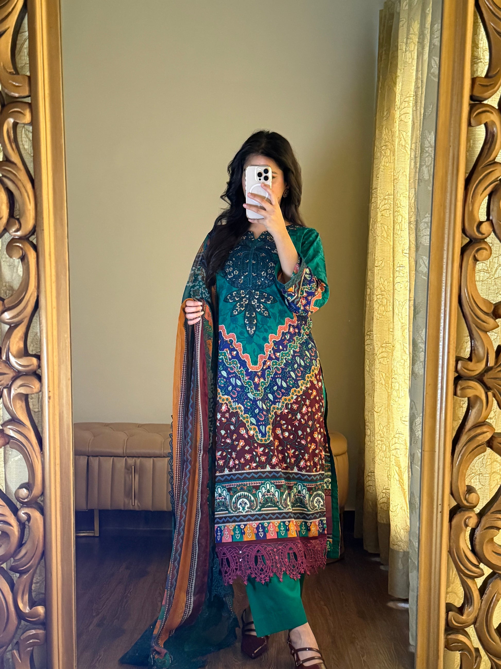Dupatta: A beautifully finished pallu Embroidery Shiffon dupatta , adding a soft, feminine touch to the ensemble.